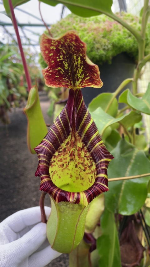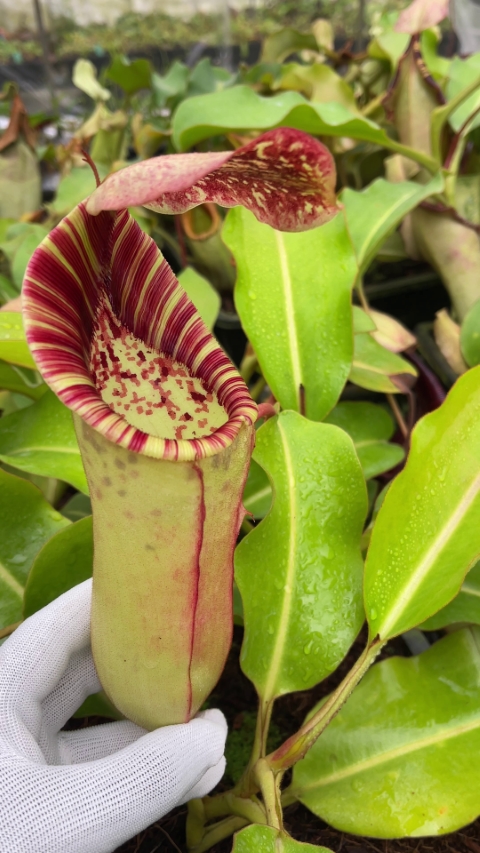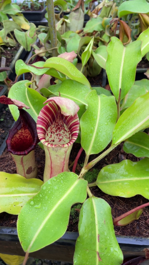 Description: A stunning natural hybrid as any photo will show. It has huge and very tough pitchers, which have several times caught mice and small rats in our nurseries, probably because they exude nectar from the underside of their lids, in the manner of the female parent.