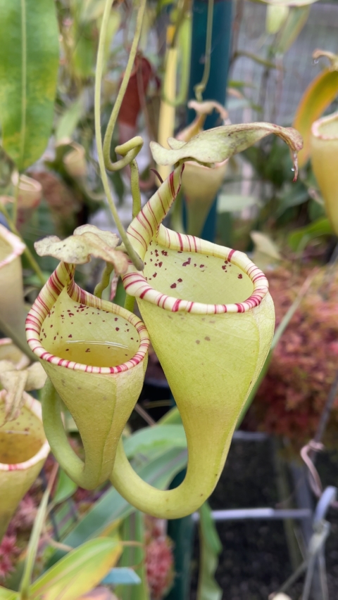 Nepenthes eymae exhibits very different upper and lower pitchers – a feature known as ‘dimorphism’, which can be observed in various guises in many Nepenthes. Dimorphism seen in this species was a key descriptor in the original 1884 paper by Shigeo Kurata. The upper pitchers are curiously infundibular, resembling a wine glass in shape. It was introduced to cultivation by John Turnbull and Anne Middleton, and all the clones arising from BE-3736 resemble the renowned ‘Turnbull and Middleton clone’ quite closely, with some being nearly identical. For a while, until we had produced many upper pitchers on many different clones, we were cautious about naming this item as the true species and used to sell it under a disclaimer, but for years now, we have been confident that BE-3736 is the real deal.