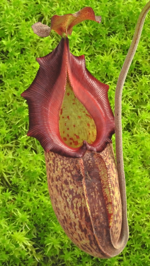The female parent is N. (maxima x talangensis) selected from the same grex as the award winning cultivar Nepenthes ‘Lady Pauline’ (‘Lady Pauline’ in fact turned out to be a male plant). The male parent is a giant and exceptionally black N. robcantleyi, which is one of the original six and has the cultivar name ‘King of Spades’. This particular clone was selected from amongst many for its exceptional vigor but in particular for the two-tone peristome which is very prominent when pitchers are young and is still visible in mature pitchers.