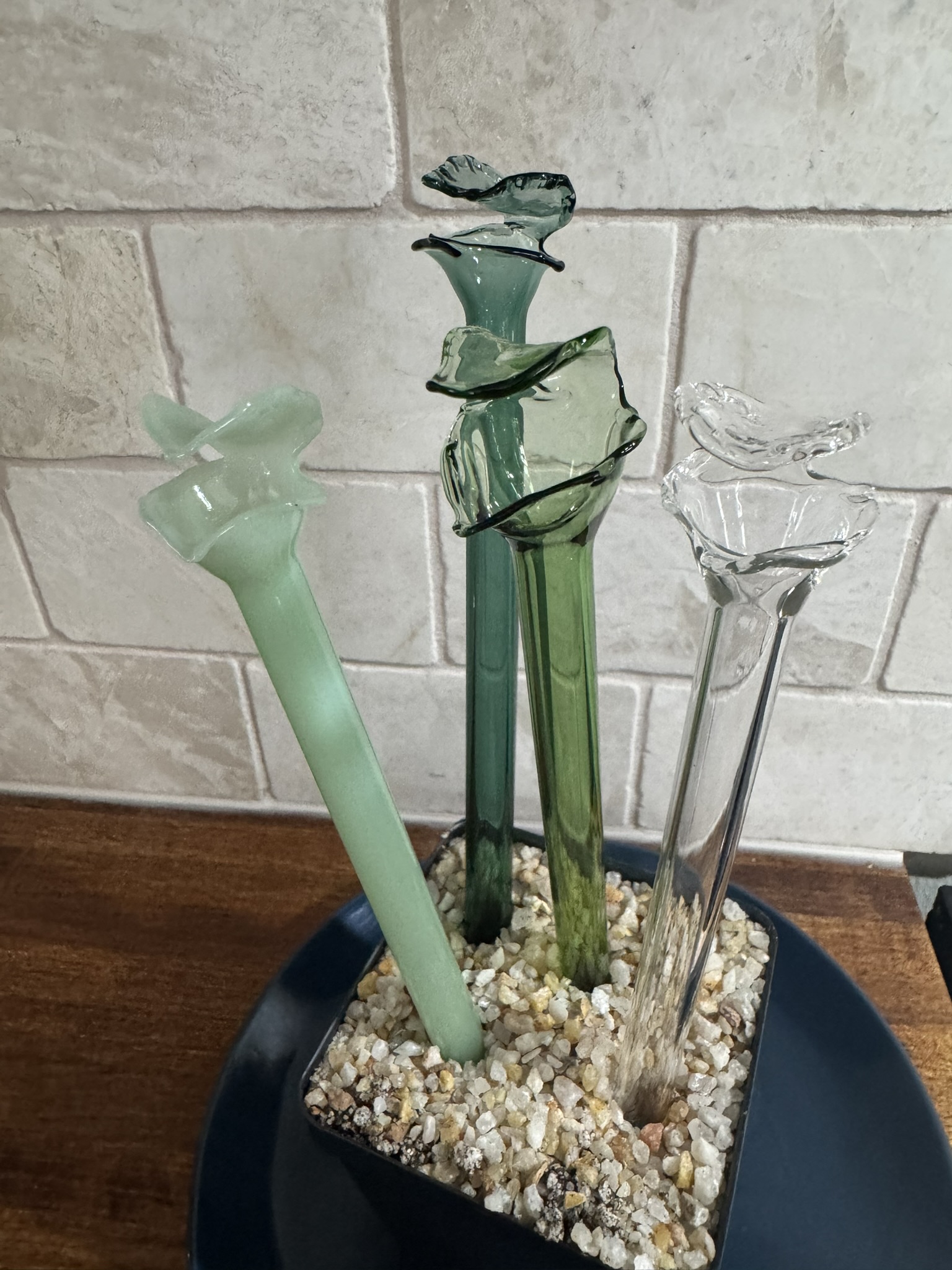 Inspired by the elegant form of Sarracenia pitchers, this handcrafted glass plant stake adds a subtle pop of color to pots and plant displays. Measuring approximately 8.5 inches tall, it’s designed to sit neatly among your plants without overpowering them.